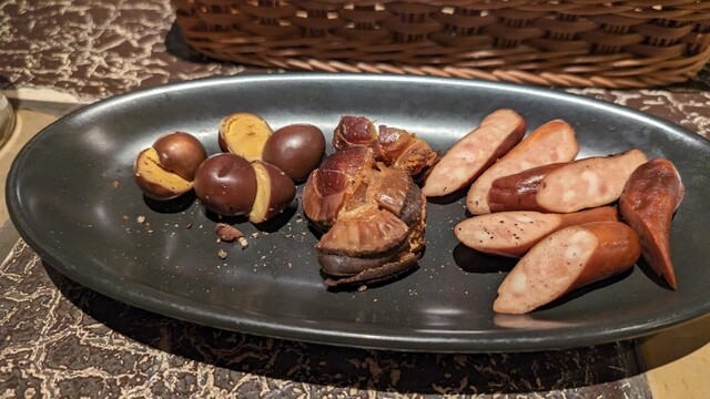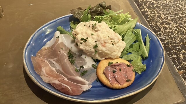注文は生ビール590円とメニューに無いおすすめのサザエの冷製パスタ1,500円にしました。お通しはおつまみ450円です。先に生ビール、そしてお通しはコスパ良しの満足プレートです!