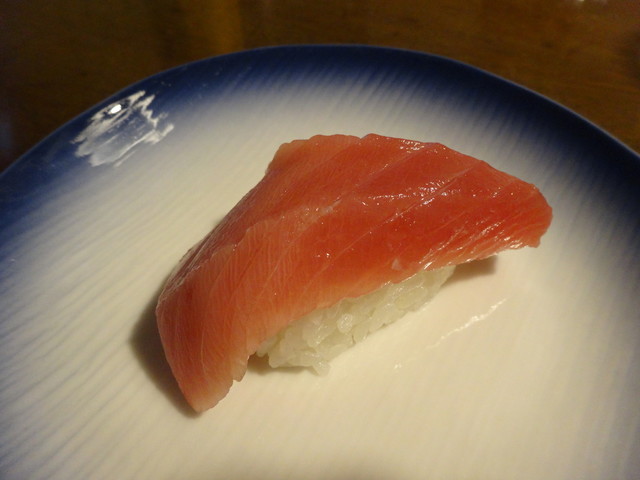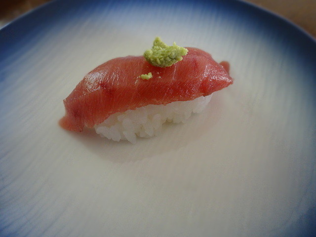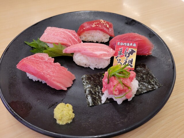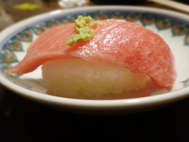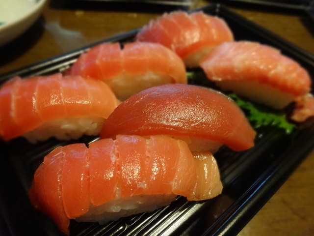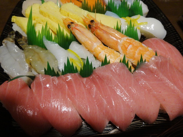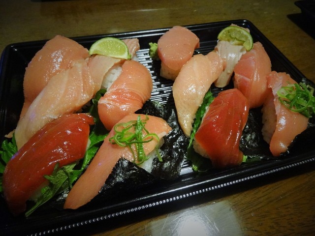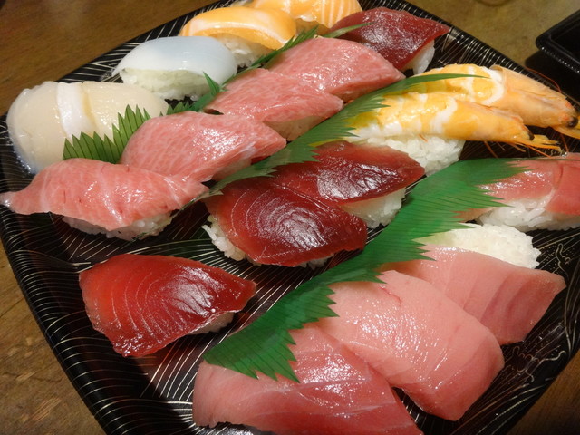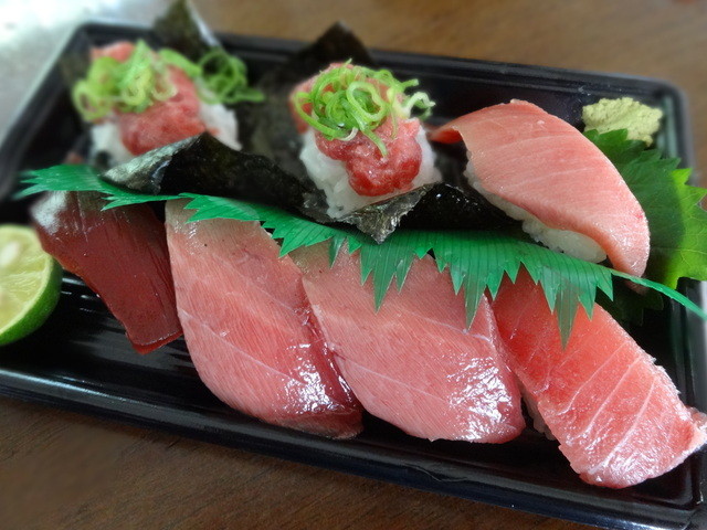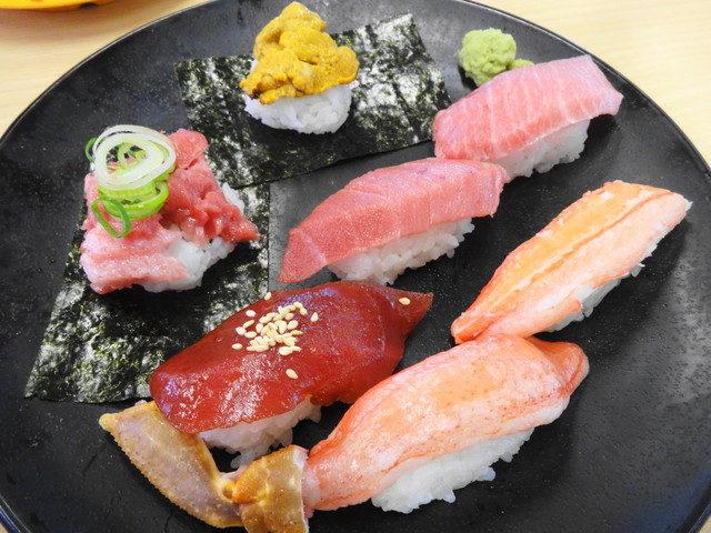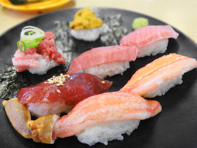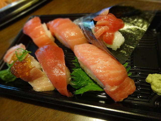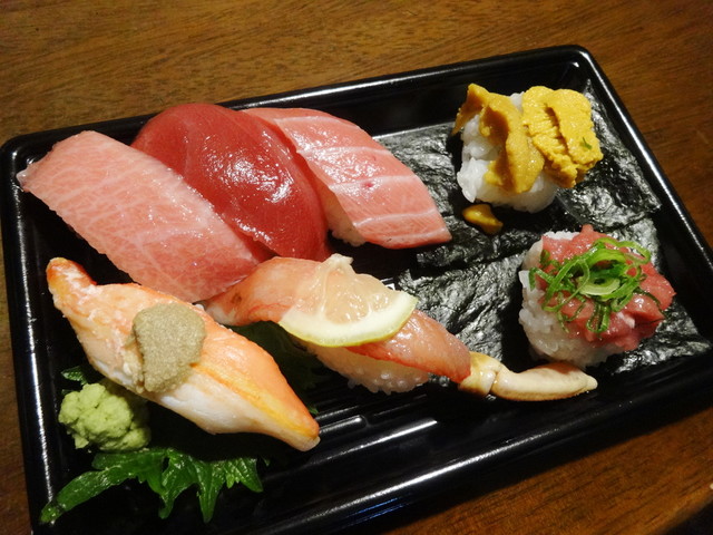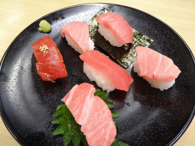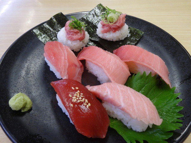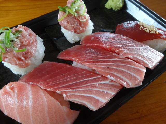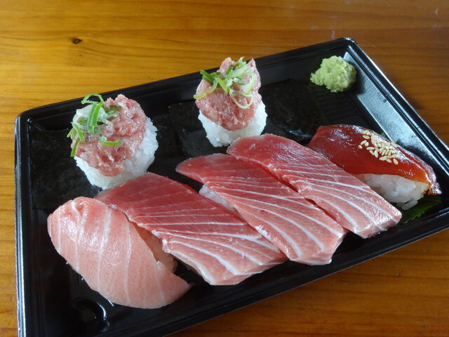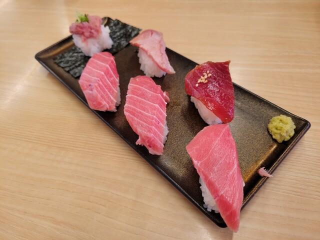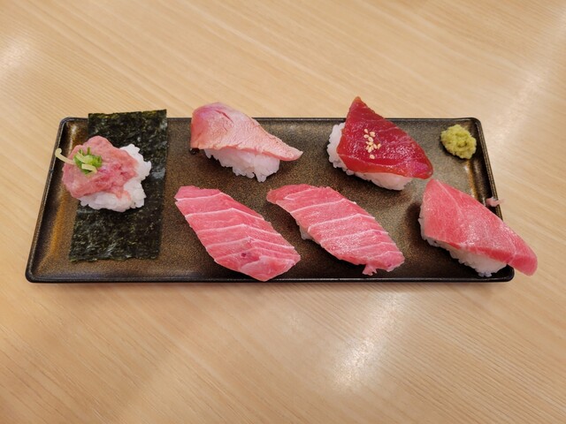 たぶん大トロ1、中トロ2、赤身漬け、炙り、ネギトロ、そんな感じ。