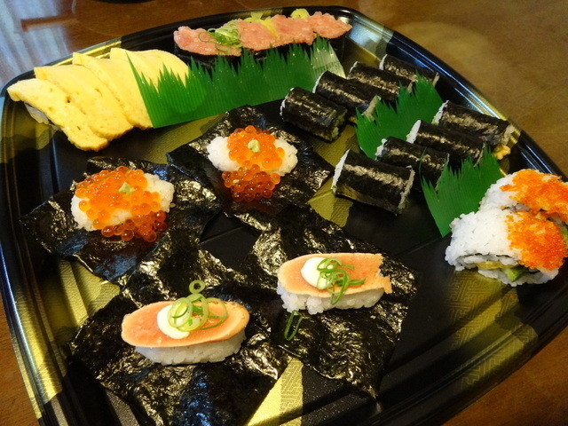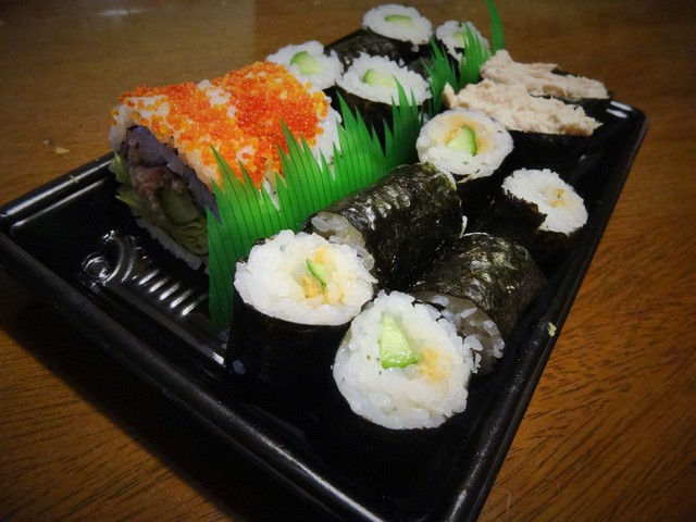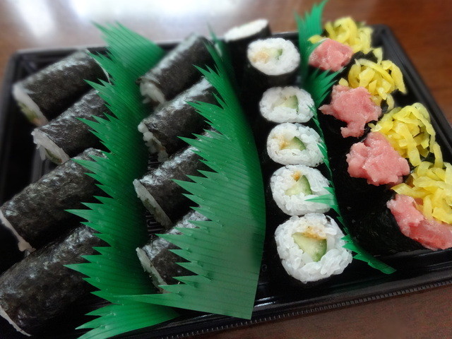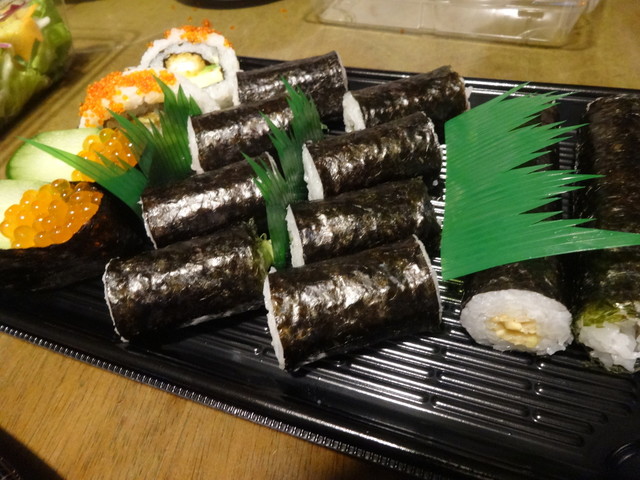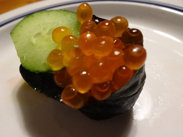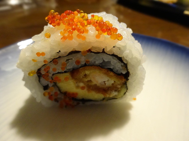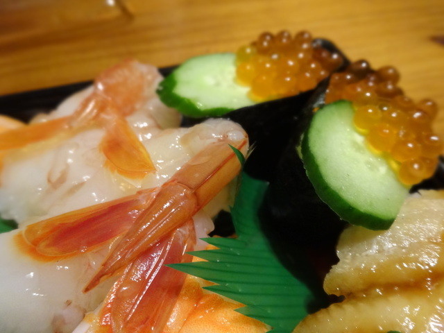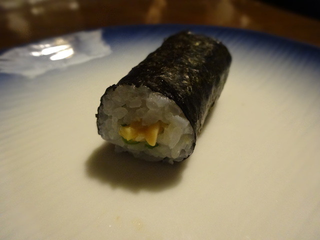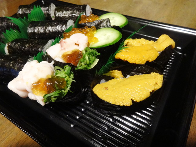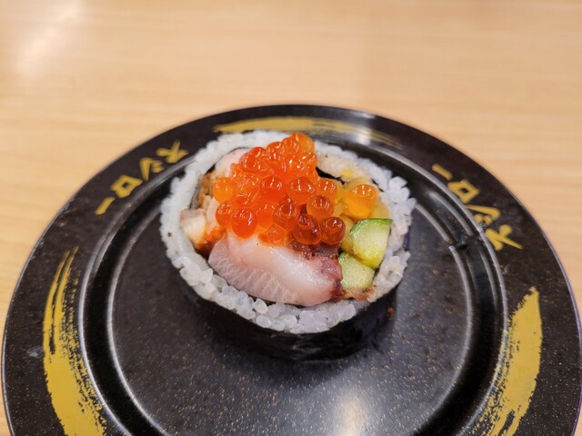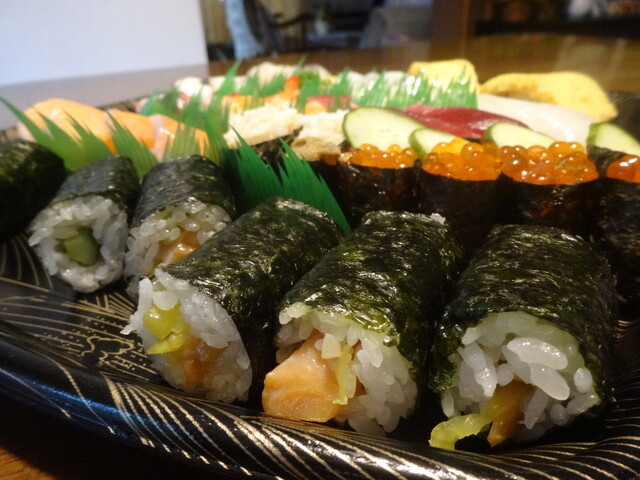 いくら、貝、穴子、蟹、などなど魚介と胡瓜、沢庵などが入った豪華太巻です。
