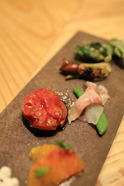 飲み物はもちろんワインペアリングです。こちらのワインは自然派が多いようです。量もその人に合わせて調節可能とのことでした。