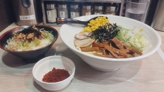 「辛塩油そば」超特盛 全部盛とっぴ♪&豚丼 大&じゃり唐辛子の3点セット