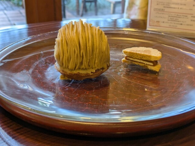 店内は温かみのある落ち着いた雰囲気。ショーケースからモンブランとブドウのタルトを注文してカフェ利用をします。