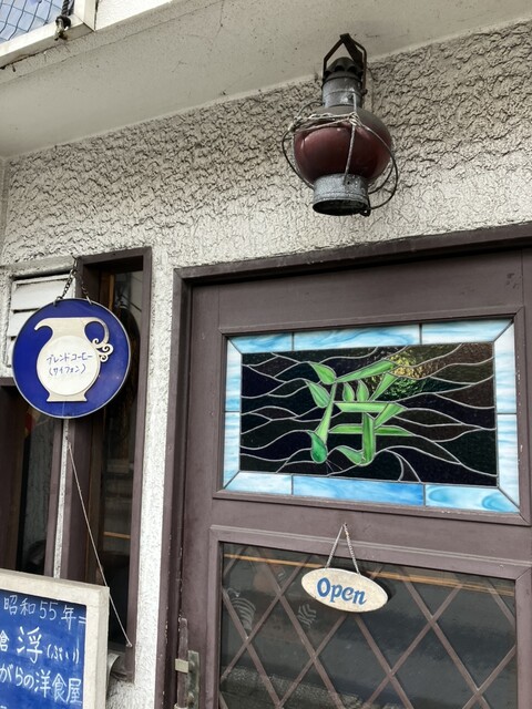 鎌倉大仏様参拝後、休憩に浮(ぶい)さんへ~。出入口は二つですが、店名ステンドグラスのカウンター席・ベンチシート側と、出窓にヨット模型を飾ったテーブル席側、どちらから入店しても中はつながってます。舷窓や錨、舵輪のテーブルなど船モチーフにあふれる店内。樹脂が変色したエアコンや、ヤニ灼けした木部、は~っ、落ち着く♪好き♡コーヒーはサイフォン仕立てで、香り豊か味深いのにキレ良いお品。コーラは瓶でご提供とい...