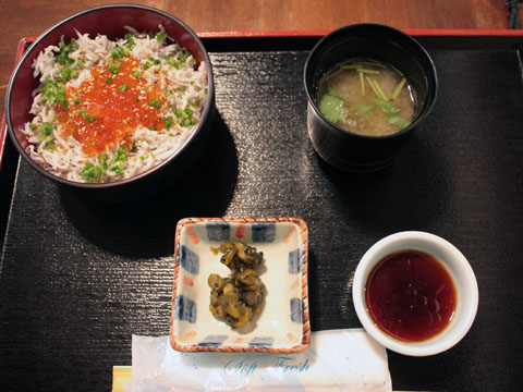妻は釜揚げしらす丼を注文、私はイクラが入った紅白丼にしました。