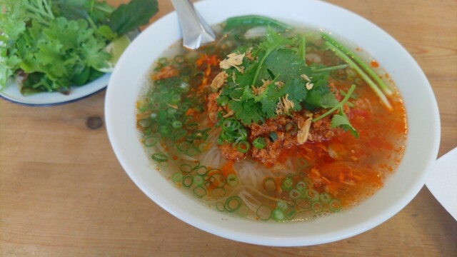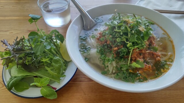優しい味のスープに辛味挽き肉が乗っています。野菜が入っていますが別皿でも野菜が添えて提供されます。フォーが長めなのですすって食べるのはちょっと...