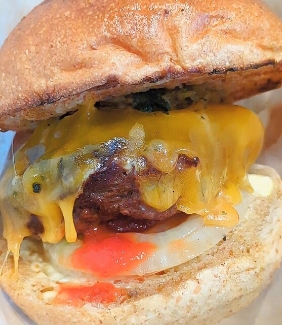 薪火で燻香を纏ったパティとモチモチ全粒粉バンズのハンバーガー