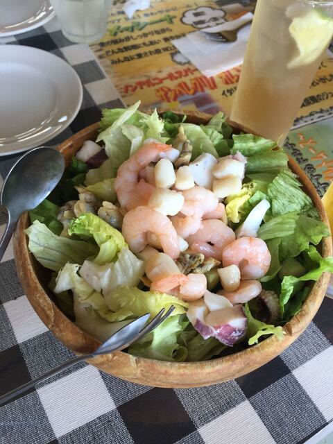 イカ タコ エビ アサリ レタスのサラダを特製のドレッシングでいただきます