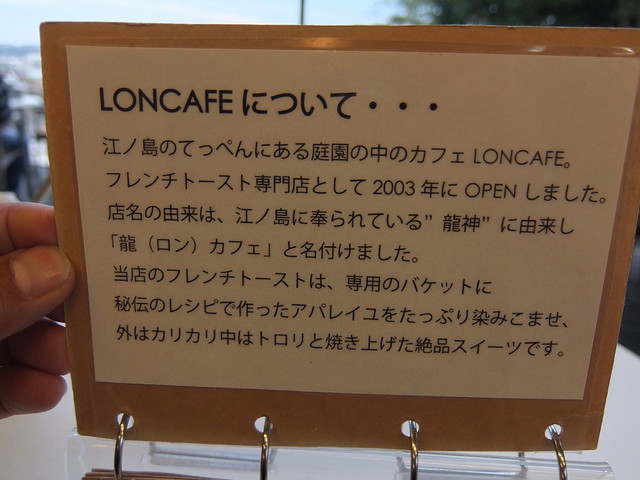 とっておきのロケーションと、とびきりのスイーツ。 LONCAFEは、江ノ島をトコトコ散歩して辿り着く島のてっぺん、サムエルコッキング苑の中にあります。 日常のほんの少し先、手をのばせば届く心地良いリゾートタイムはいかがですか? 相模湾を望む絶景のテラスと自慢のスイーツ「フレンチトースト」でお待ちしています。