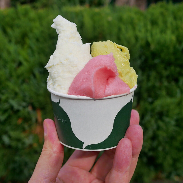 江ノ電が、カタンと目の前を横切る。 潮の気配が混じる風の中で頬張るジェラートは、 ただの“冷たい甘味”ではありませんでした。 江ノ島駅すぐそば、龍口寺門前の交差点に佇む 『ザ マーケット エスイーワン』。 ロンドン帰りの元F1チーム専属シェフが手がける、湘南の小さなジェラテリアです... 詳細を見る