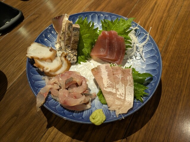 今日のお刺身は、カツオとカツオのたたきとイカと白身のお魚。
