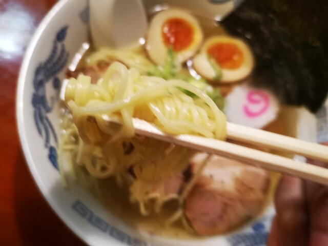 見た目とは裏腹に濃いめなガラ塩スープがストレート細麺と絡んで実にいい感じ。ただ茹で加減的には次回はメンカタにしてみるか。