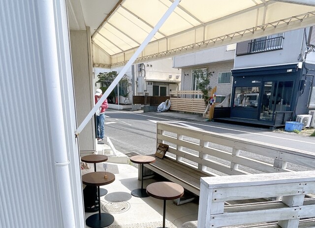 外に腰掛けのベンチがあるのでその場で飲むのも可能です。
