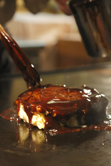 店主さんが焼いて目の前の鉄板に運んでくれます。