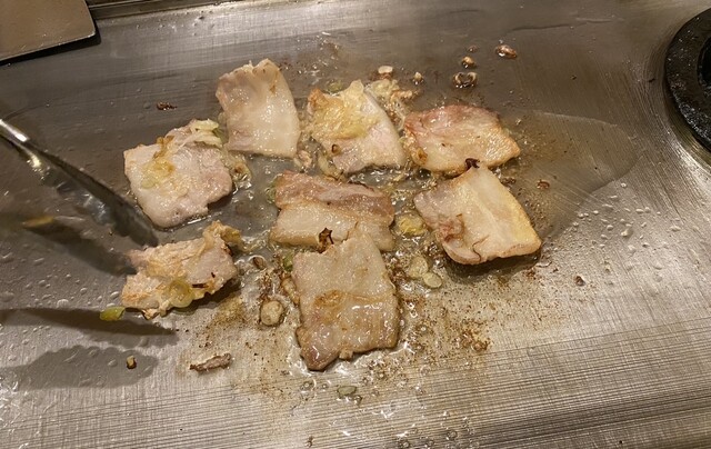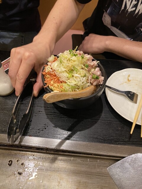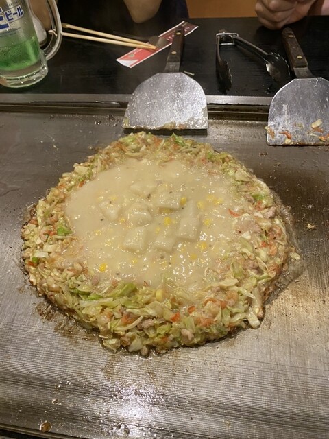 この日のもんじゃは、ねぎ塩豚もんじゃに餅とコーンをトッピング。