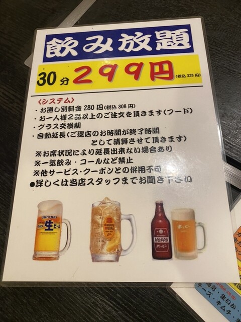 まずは飲み放題30分299円をオーダー。(1人フード2オーダー制)