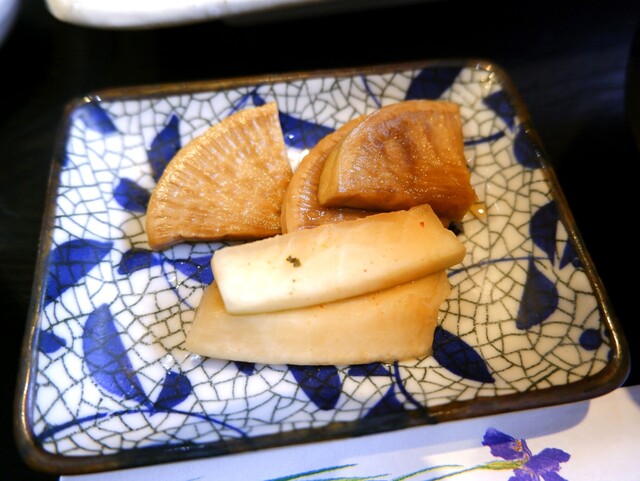 専用駐車場に車を停めてお店に向かうとランチ看板が置かれていました。お店の入口は緑の枠をくぐって行きます。入店してカウンター席の隅に着くと女将さんがお茶を出してくれました。