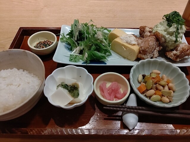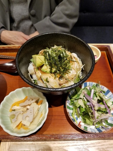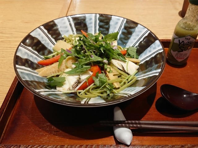 和カフェということで、スイーツや日本茶が充実しているお店です。 結構人気で、12時の昼時だと待ち客が出ます。 食事メニューはお膳、サラダごはん、パスタ、お茶漬けといったラインナップ。 サラダごはんは、丼ものってイメージで良さそうです。 パスタは京抹茶が練り込まれているようで、色々と工夫が... 詳細を見る