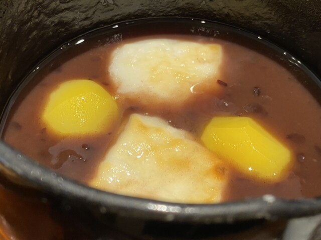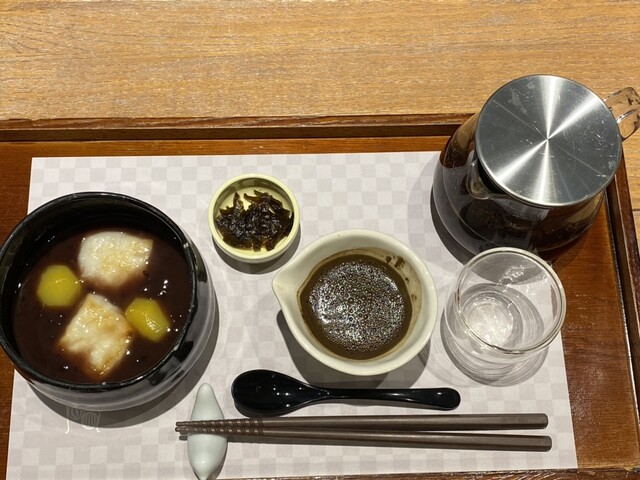 ソファー席で寛ぎながらメニューを眺め、ほうじ茶ぜんざいと和紅茶のセットを頼みます。注文はQRコードからとの説明を受けましたが、店員さんが親切にもテーブルに来てくれました。ありがとうございます。