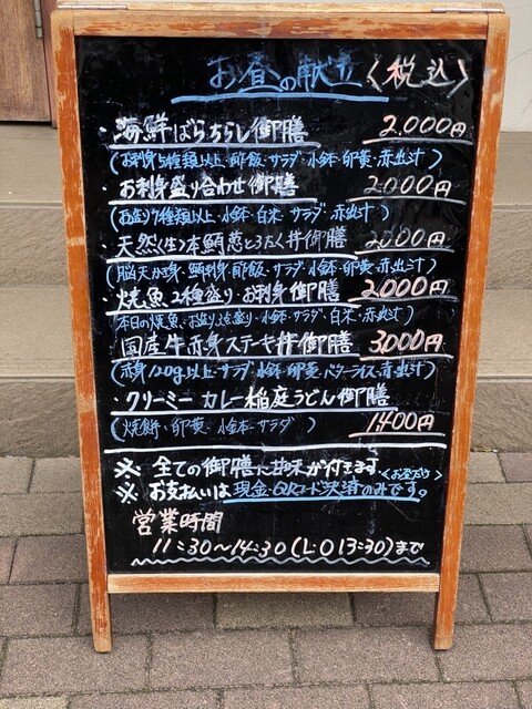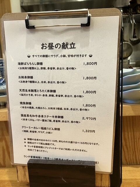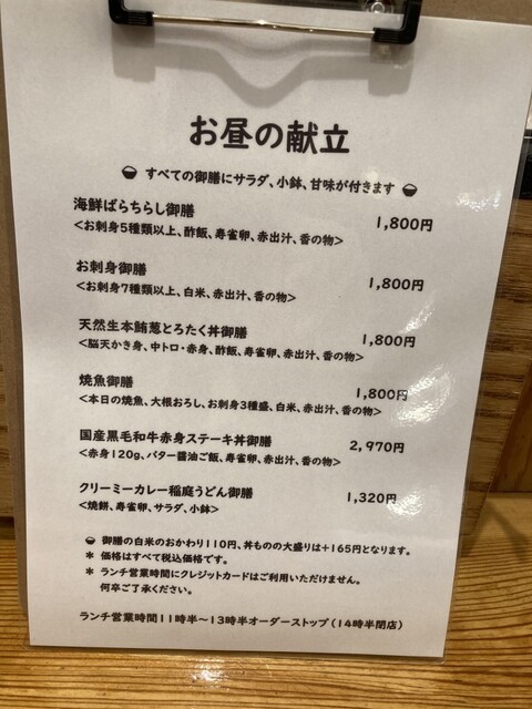 メニューは刺身、丼物、焼物、ステーキなど。