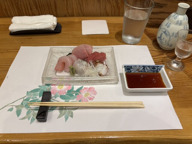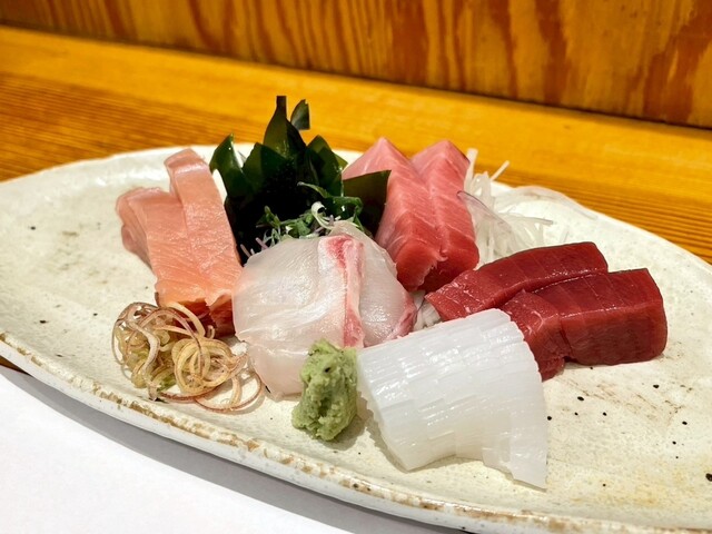 席のみ予約で料理は当日のオススメを中心にオーダー。刺身の盛り合わせはお任せで。