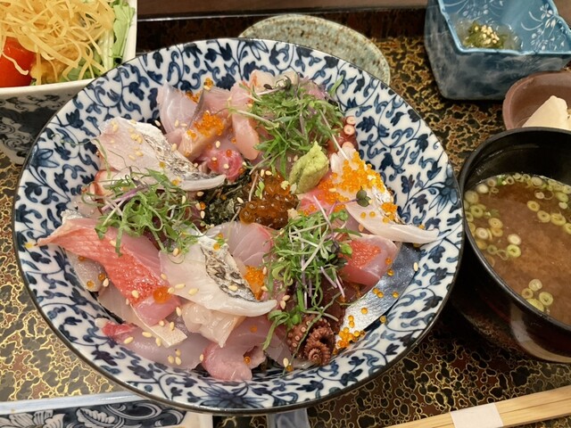 ばらちらしは、マグロ、かつお、ホタテ、海老、タコ、カンパチ、いくらがのっていて豪華。
