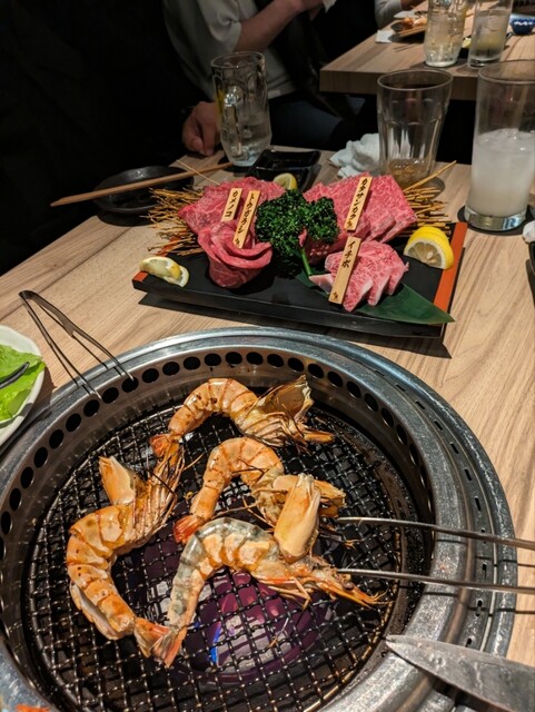 黒毛和牛カルビ希少部位5種盛り合わせ、上タン塩に、黒毛和牛ドラゴン中落ちカルビ、牛ハラミステーキ盛り、本日のホルモンのお肉9種類と有頭海老の塩焼き、3種キムチ.一口ユッケ.シーザーサラダ.土鍋の牛すじうどん.デザート迄付いた全15品の1番人気プラン