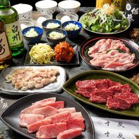 ~山崎・白州(山崎・白州でお一人様どちらか1杯迄)や富乃宝山、佐藤、群馬泉山廃純米等もお楽しみ頂けるプレミアム飲み放題付!~ 黒毛和牛カルビ希少部位5種盛り合わせ、上タン塩に、黒毛和牛ドラゴン中落ちカルビ、牛ハラミステーキ盛り、本日のホルモンのお肉9種類と有頭海老の塩焼き、3種キムチ.一口ユッケ.シーザーサラダ.土鍋の牛すじうどん.デザート迄付いた全15品の1番人気プラン