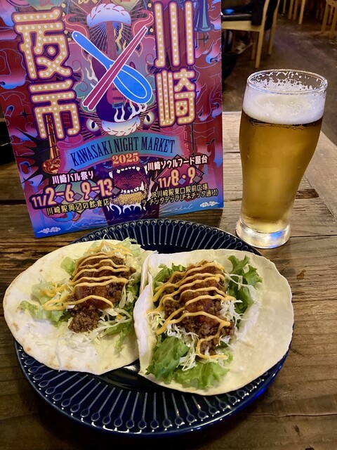 平日夜に訪問 JR川崎駅東口から徒歩10分圏内 仲見世商店街沿いにあります ★タコス2P&ドリンク1杯税込1000円 川崎夜市限定メニュー メキシコ料理の一つ 野菜... 詳細を見る