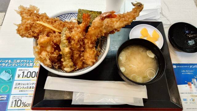海鮮上天丼1430円、味噌汁110円を注文。