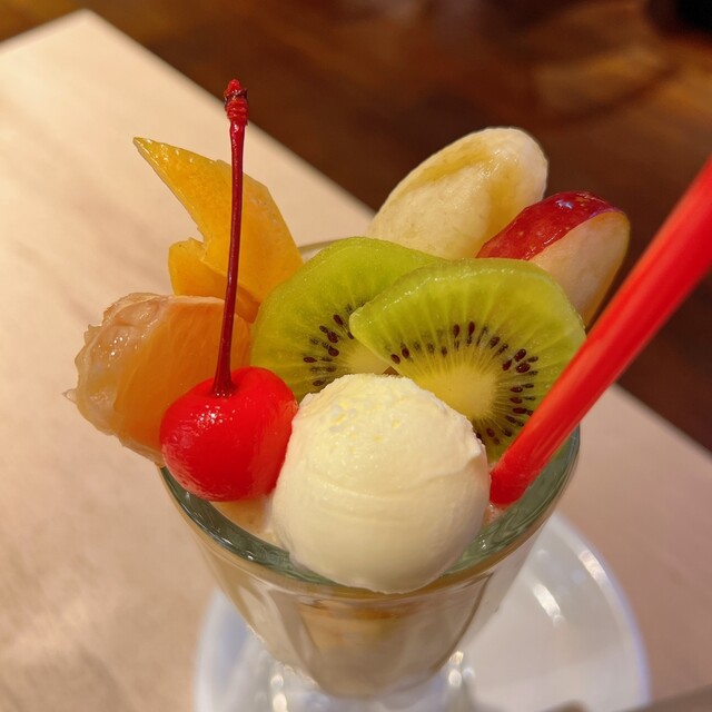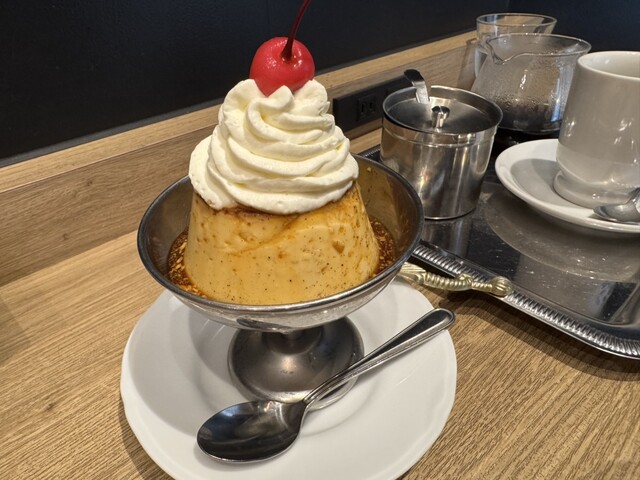 運ばれてきたプリンは、昔ながらの銀の器に乗った、まさに王道の佇まい。スプーンを入れると、しっかりとした固めの感触が伝わってきます。一口食べると、卵のコク深い味わいが口いっぱいに広がり、どこか懐かしい気持ちになりました。甘さは控えめで、底...