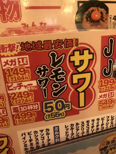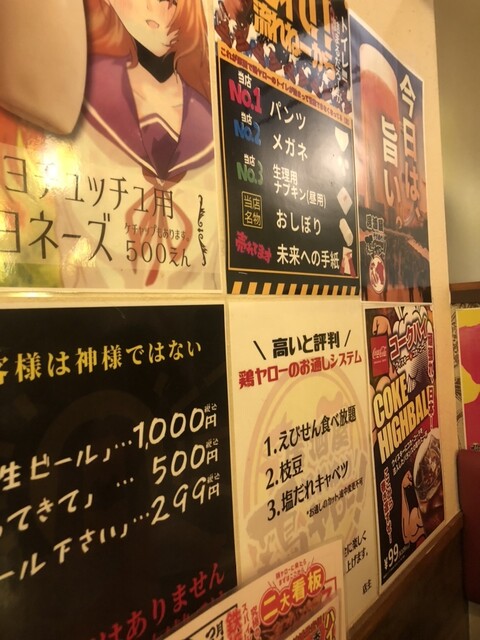 所持金は乏しいけど飲みたい!そんな時は安定の鶏ヤロー!お酒の価格がバグってる!お通しやおつまみはちと高いけどお酒が安いのでオッケー!タバコが吸えるのも私には評価たかい。若者が多いので賑やかなところがまた良いと思う。