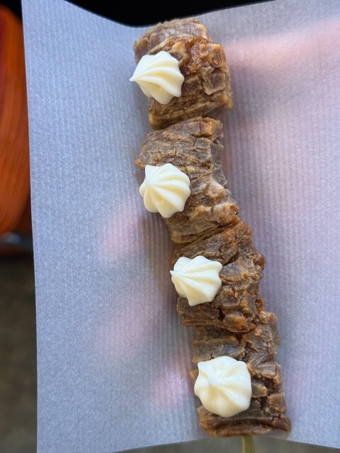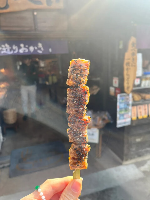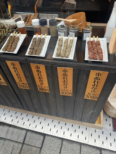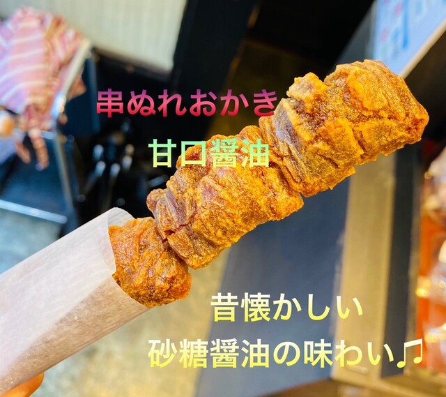 たまり醤油がじゅわ〜っと染みた、アツアツのぬれおかき串。