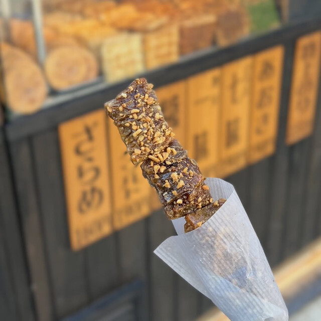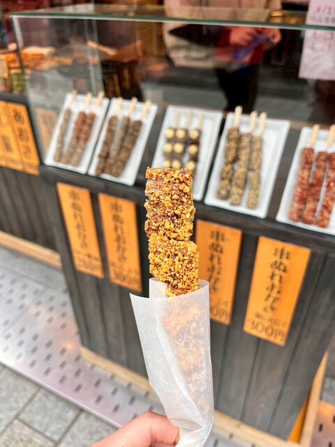 大人気の串ぬれおかきは、もちもちの食感とおかきの風味がダブルで味わえる逸品♪ お土産には令和開運セットのだるま巾着入りが超おすすめ最適♫ 「寺子屋本舗 川崎大師店」さんの巻(●´ω`●)