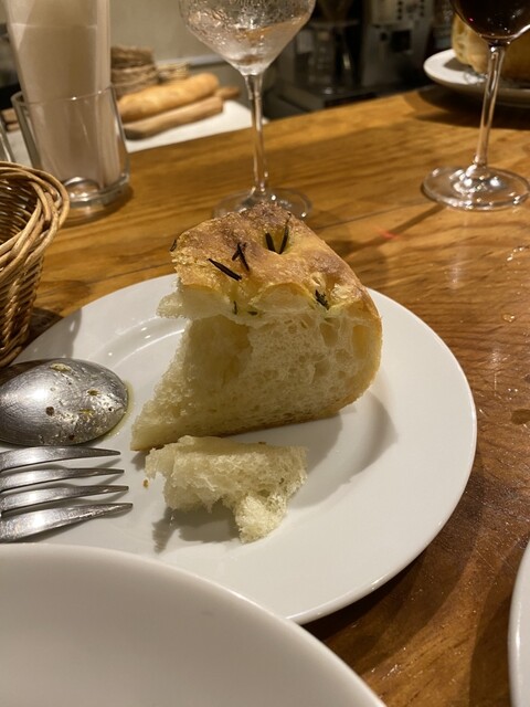 フォカッチャはローズマリーの香りはせず、バゲットは提供されて直ぐは側を剥がして食べオイルに浸けて美味しいのですが、時間を置くと硬く側を剥がせない