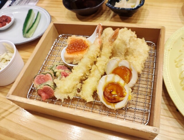 海老天、半熟玉子天、鶏天、明太子しそ巻き天、サーモンいくら天。