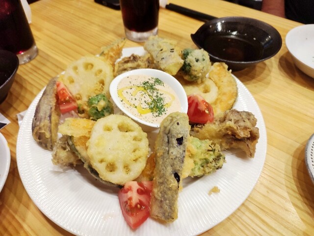 ナス、蓮根、マイタケ、ブロッコリー、カボチャの天ぷらを明太子ディップで。