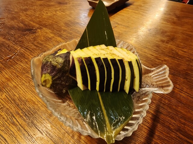 お料理はまず「水茄子の刺身」。みずみずしい甘みと爽やかな食感が、火照った体に心地よい。