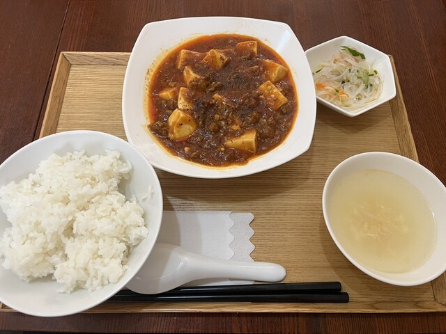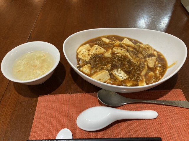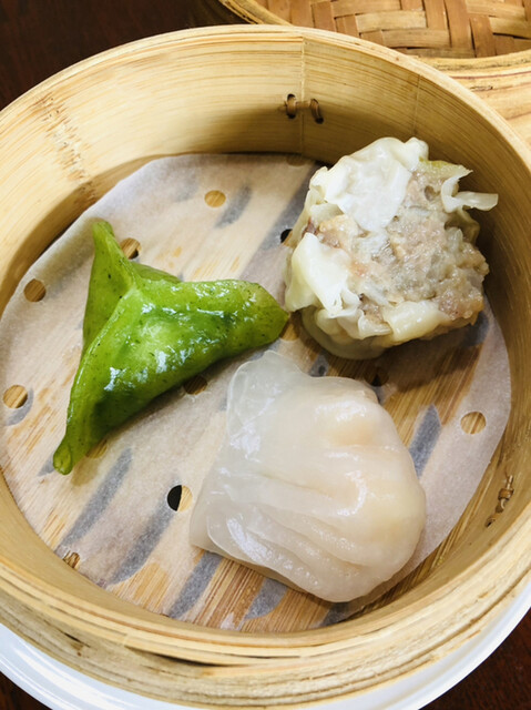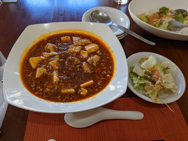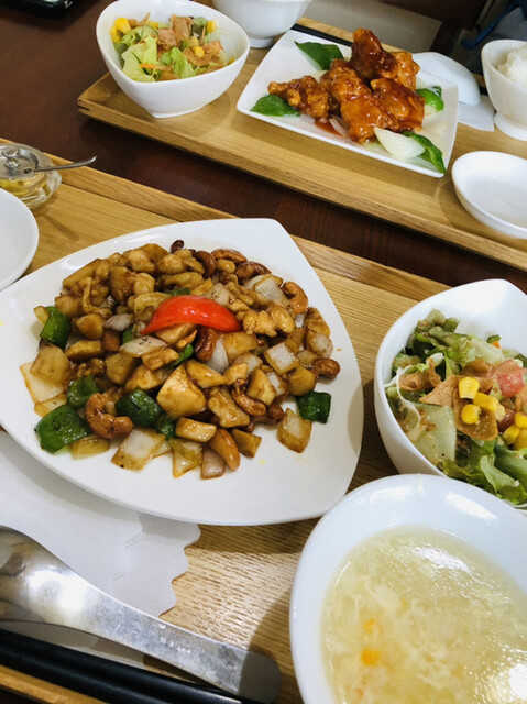 セットメニューの構成は、メインに加えて特製サラダ、主菜、蒸し物(焼売、エビ餃子、ヒスイ蒸し)、ご飯、スープ、デザート(杏仁豆腐)です。...