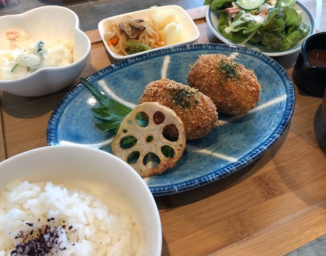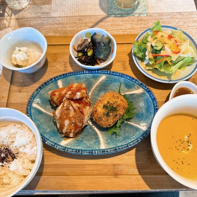 心と体にやさしい、ごはんとスイーツをご用意。豆腐と長芋のコロッケセットや自家製ローストビーフ等のランチメニューや、豆乳を使ったふわふわシフォンケーキなど、自家製スイーツも人気です。週末の夜はお酒とおつまみメニューも充実しています!