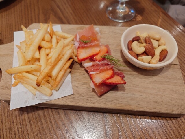 あまりお腹が空いてなかったので、カム目におつまみ盛り合わせを注文です。この日は生ハム、フライドポテト、ミックスナッツの3種盛りで、お酒のお供に持ってこいです。