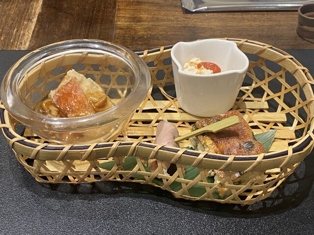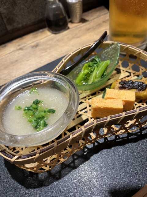 やっと伺いました。新百合ヶ丘の評判店。前菜三種は、かぶ煮・茸大根おろし和え・いか味噌和え。次は茸と豆腐の茶碗蒸し。続いて、漬けま...
