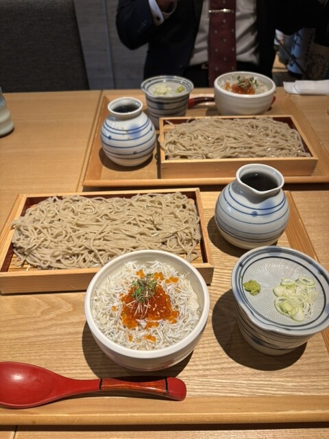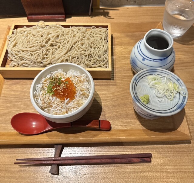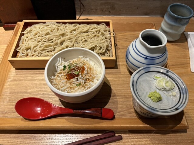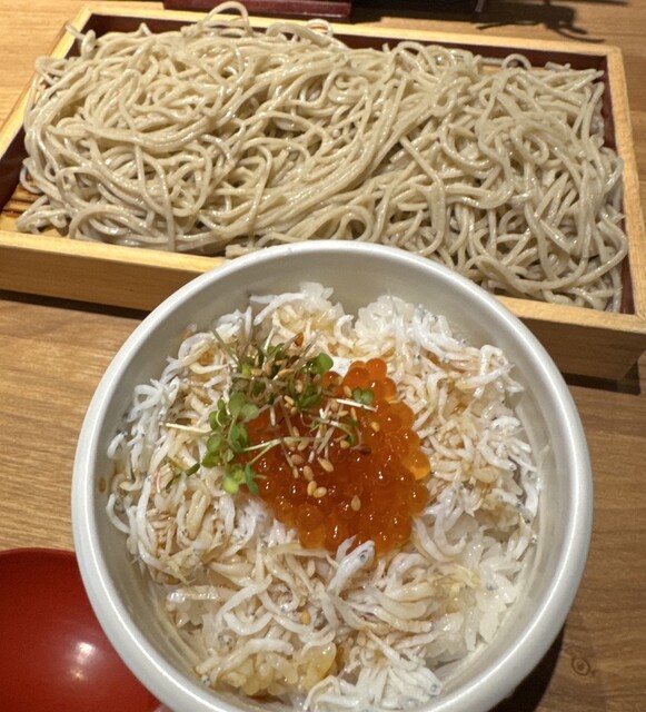 カウンターに通され自家製蕎麦としらすといくらの子丼蕎麦の大盛¥1,200を注文、蕎麦...