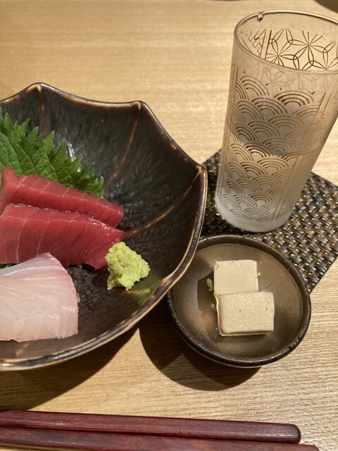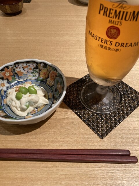 まずは瓶ビールを注文。お通しの鮪の煮凝りがしっかりと味が染みていて、これ...