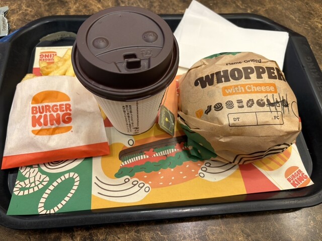 全然自分の番号が呼ばれる気配が無いまま7〜8分経ちようやく自分の番号がコールされワッパーチーズバーガーとドクターペッパー、フレンチフライ食べられる〜。