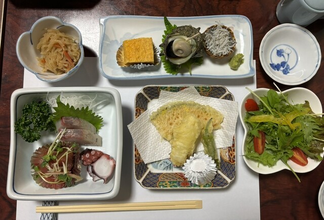 ランチメニューは基本2500円で、好きなメインにご飯味噌汁刺身天ぷらサラダが...