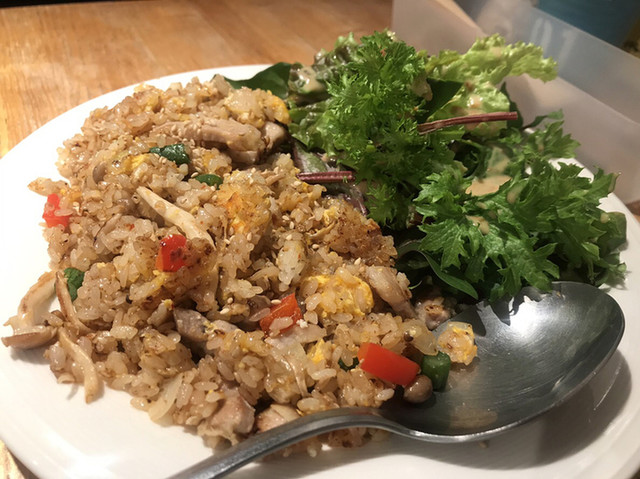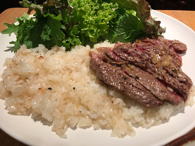 ガーリックライス ステーキ乗せのガーリックライスはにんにくが大きめのカットで入っていて美味しかった。