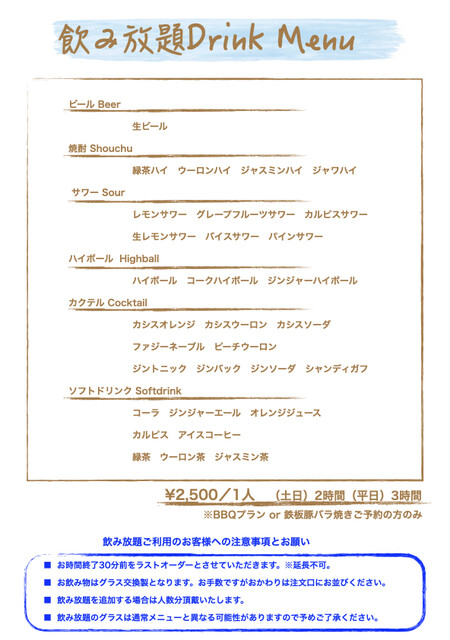 | ドリンク | 焼酎あり、ワインあり、カクテルあり |