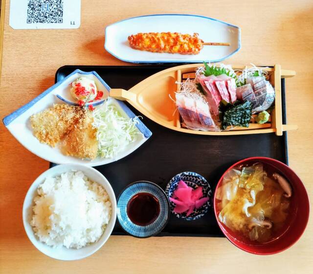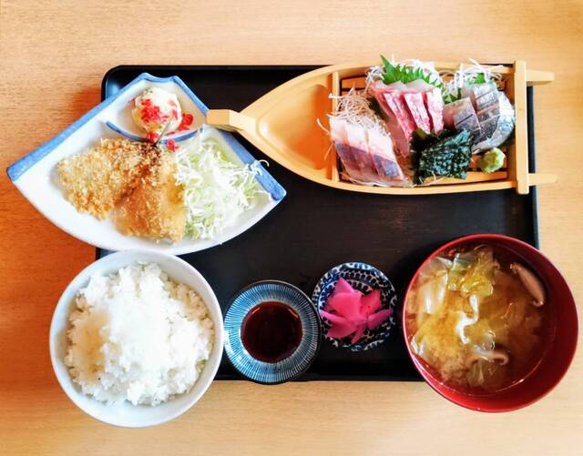 ● おまかせ刺し盛り定食+アジフライ:刺身の盛り合わせ・アジフライ・漬物・ご飯・あら汁の組み合わせ。