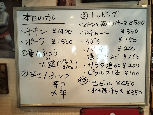 口コミを見て随分前から行きたいなと思っていたカレー屋さん。電車を乗り継いで相模原駅に到着。さらにそこから10分、いやそれ以上歩いて10時に到着。開店前だったので整理券と注文を聞かれ、ポークカレー辛口を...