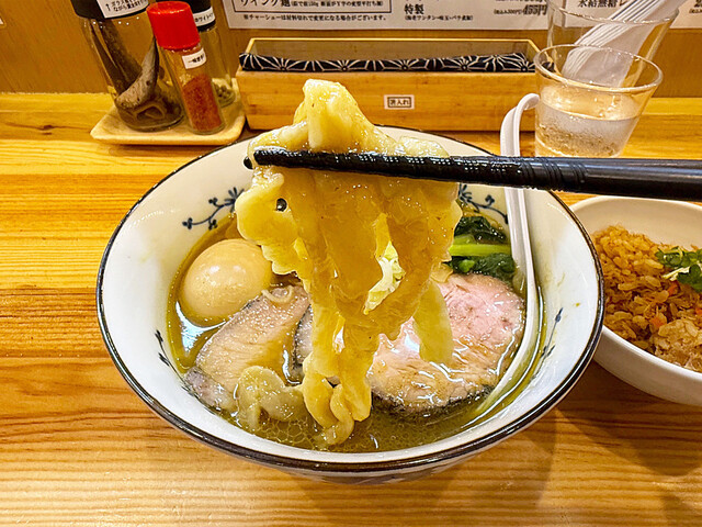 真鯛ワンタン麺+つけ麺変更 1300+250 まかないご飯(温玉カレー) 300 つけ麺 Xにて限定麺の情報あり。 細麺130gと手打ち麺150gの合盛り。スープ割りは無しとの事(スープが濃くないので)。 麺量は合わせると一般的つけ麺の大盛に近いくらいあり、ボリューム◯。昆布水は出汁... 詳細を見る